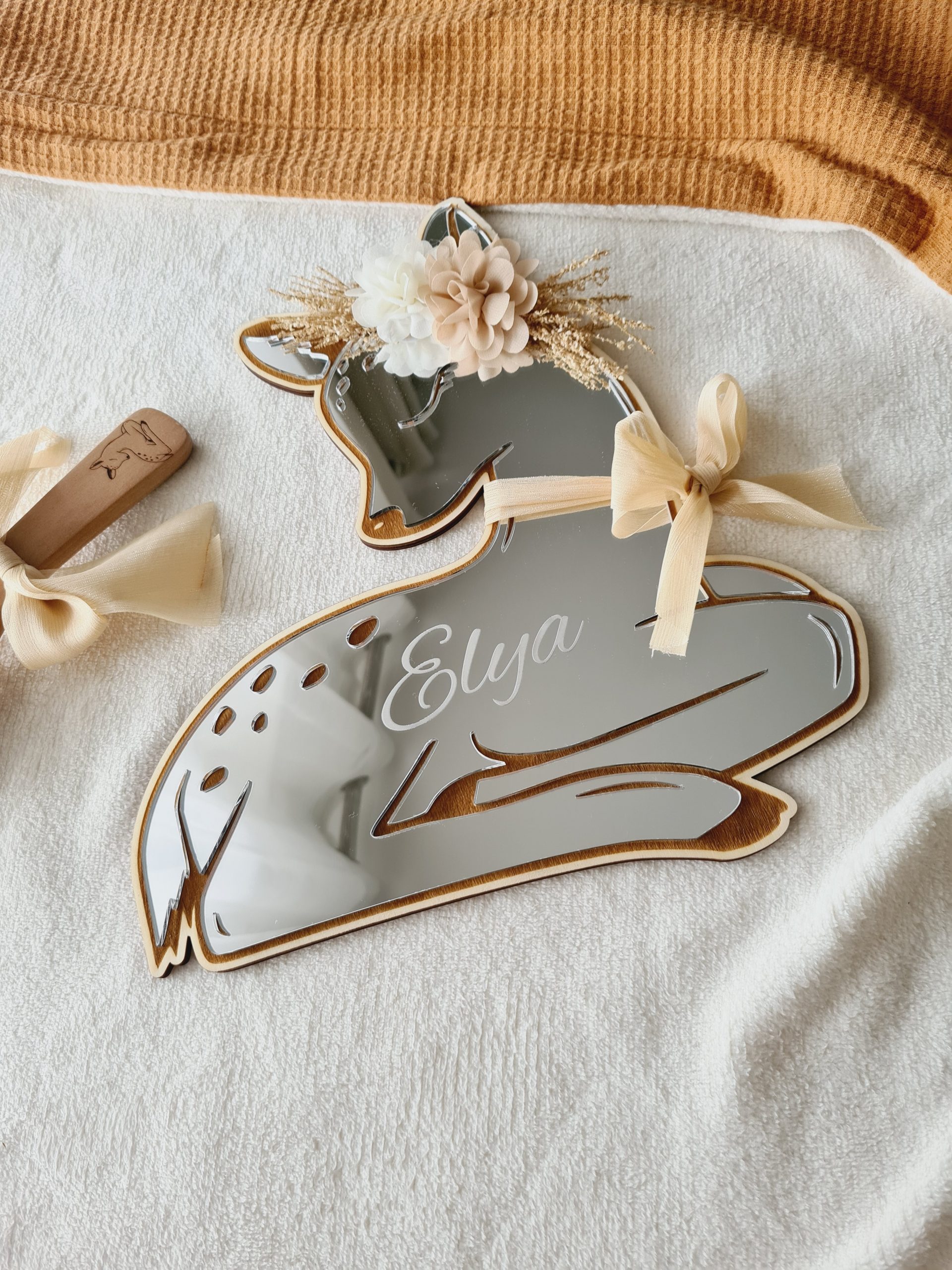 Je suis ravie de vous présenter mon dernier chef-d’œuvre, un miroir unique en forme de faon, orné de fleurs délicates sur sa tête.