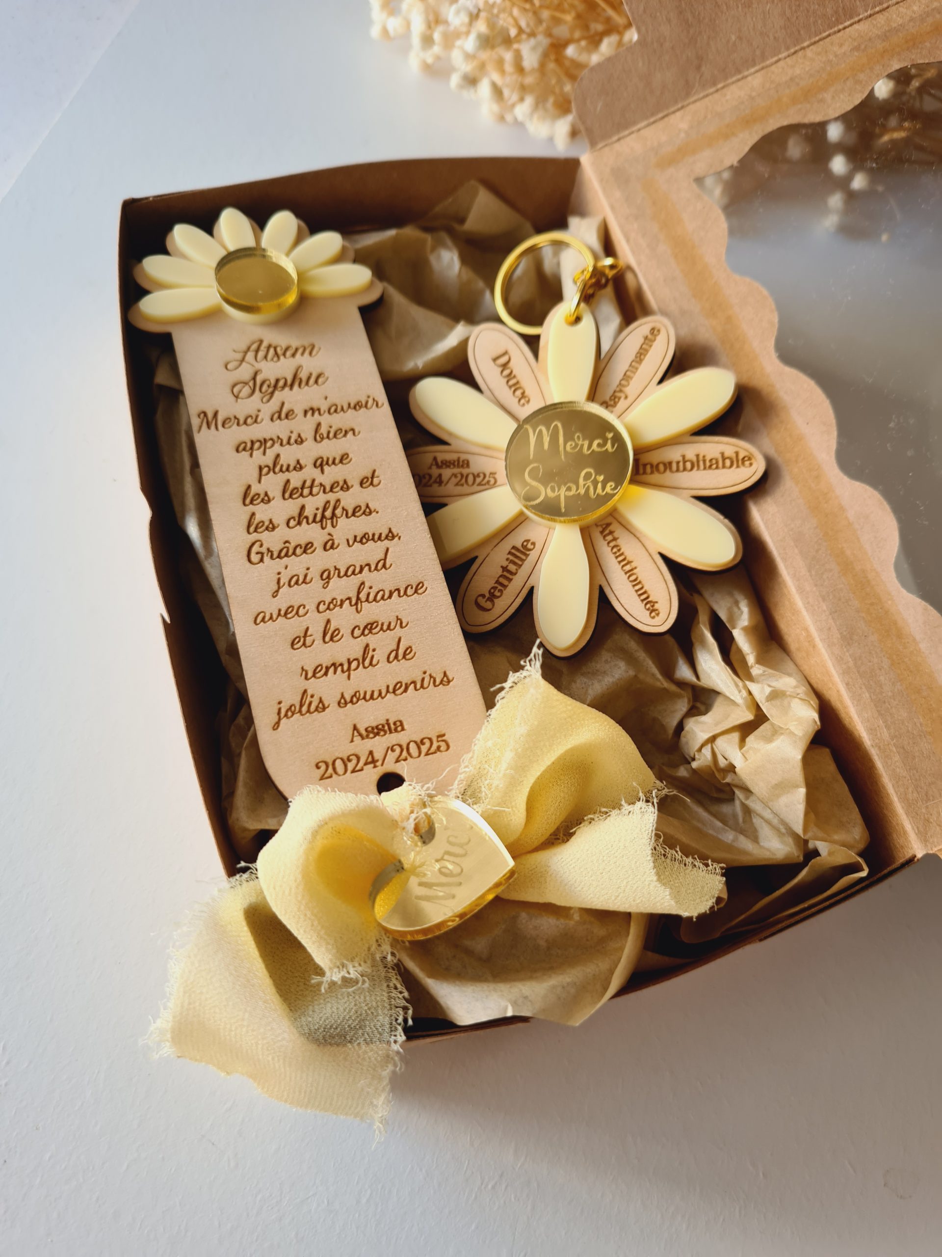 Un beau pack à personnaliser composé d’un porte clé marguerite et d’un magnet marguerite.