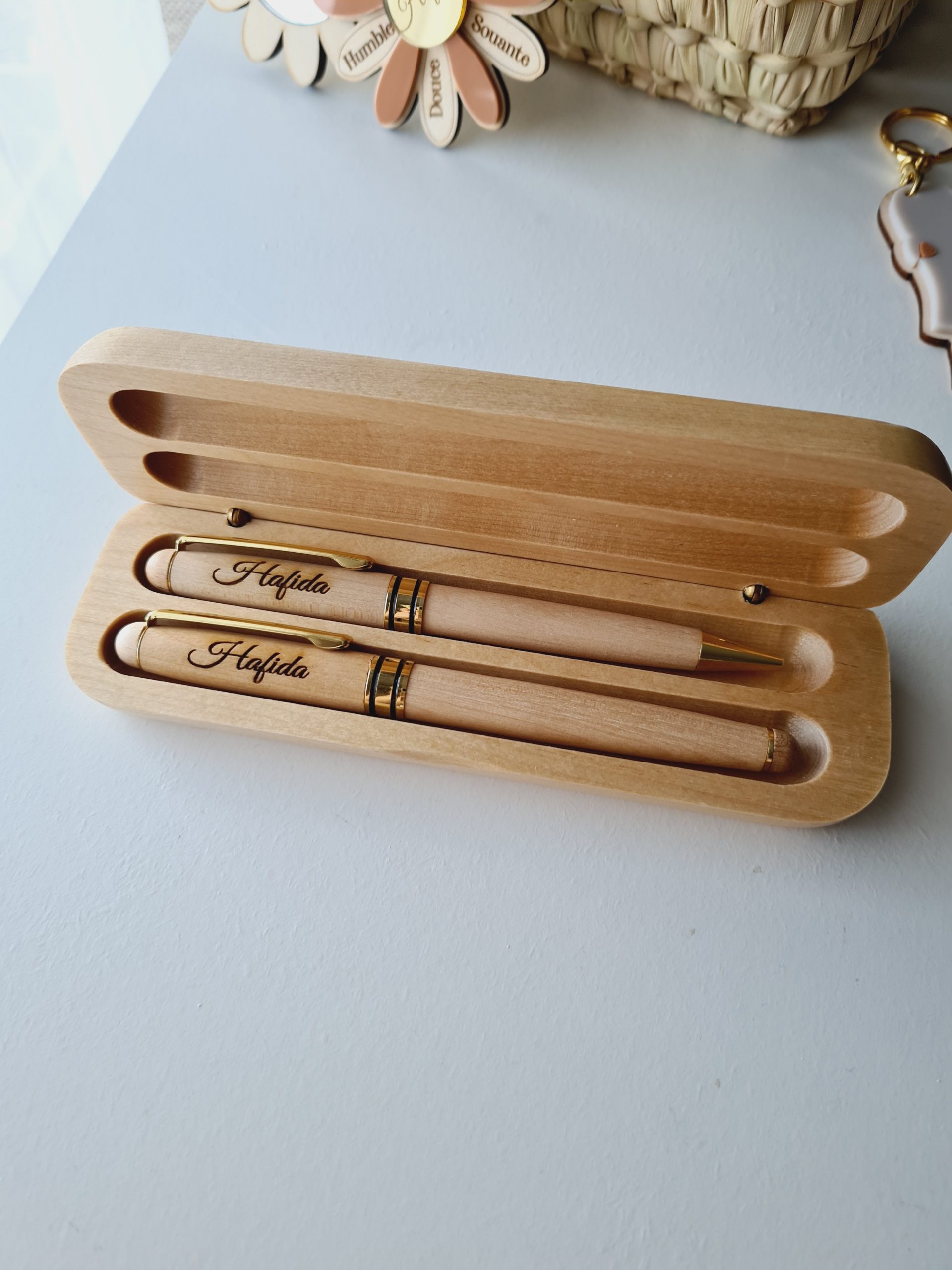 Plumier en bambou contenant 2 stylos à personnaliser, il faudra me préciser le texte à mettre sur le dessus ainsi que les motifs.