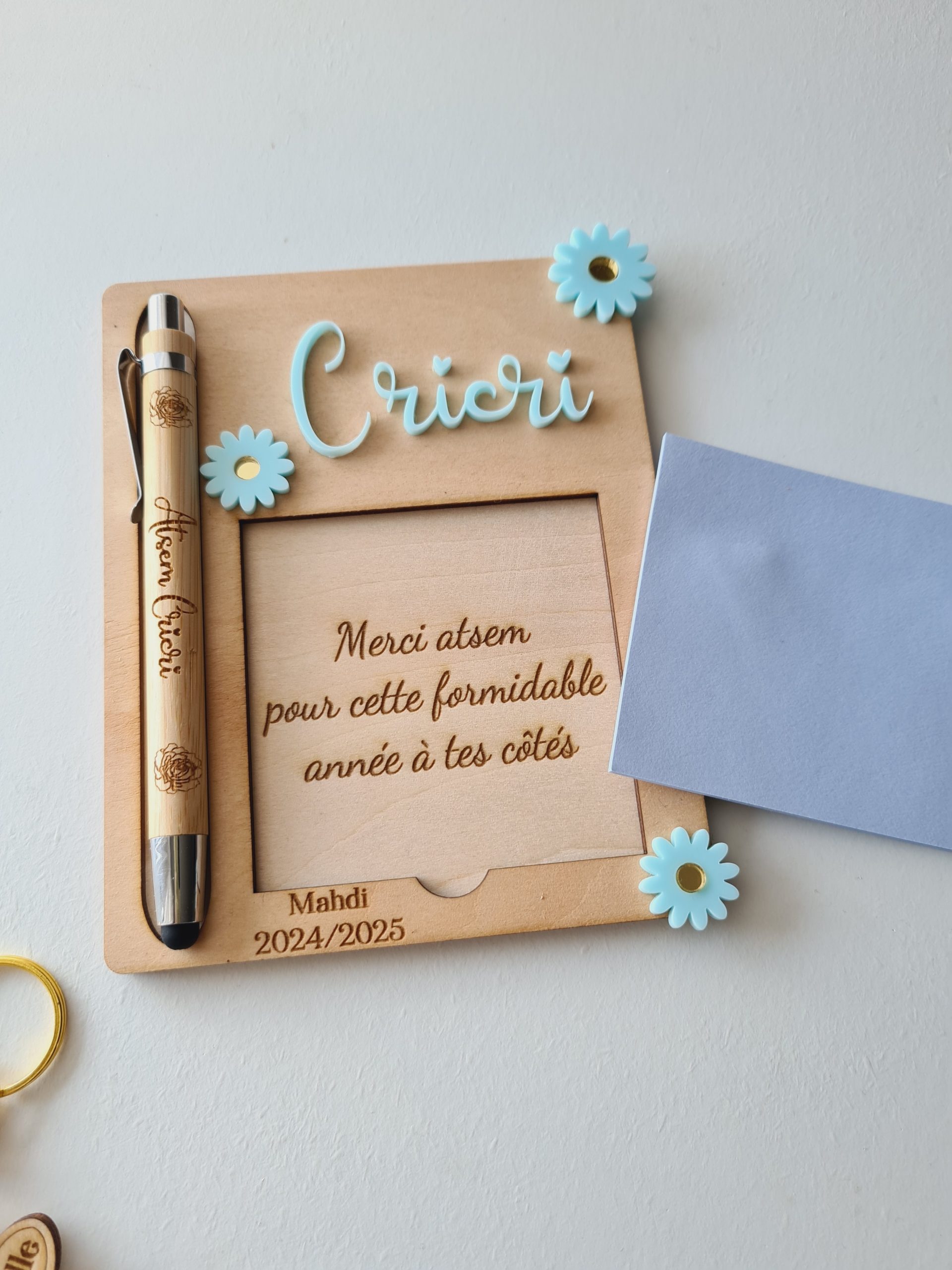 Il faut me préciser le nom à mettre sur le dessus, ainsi que le texte à graver sous les post it si vous en souhaitez un