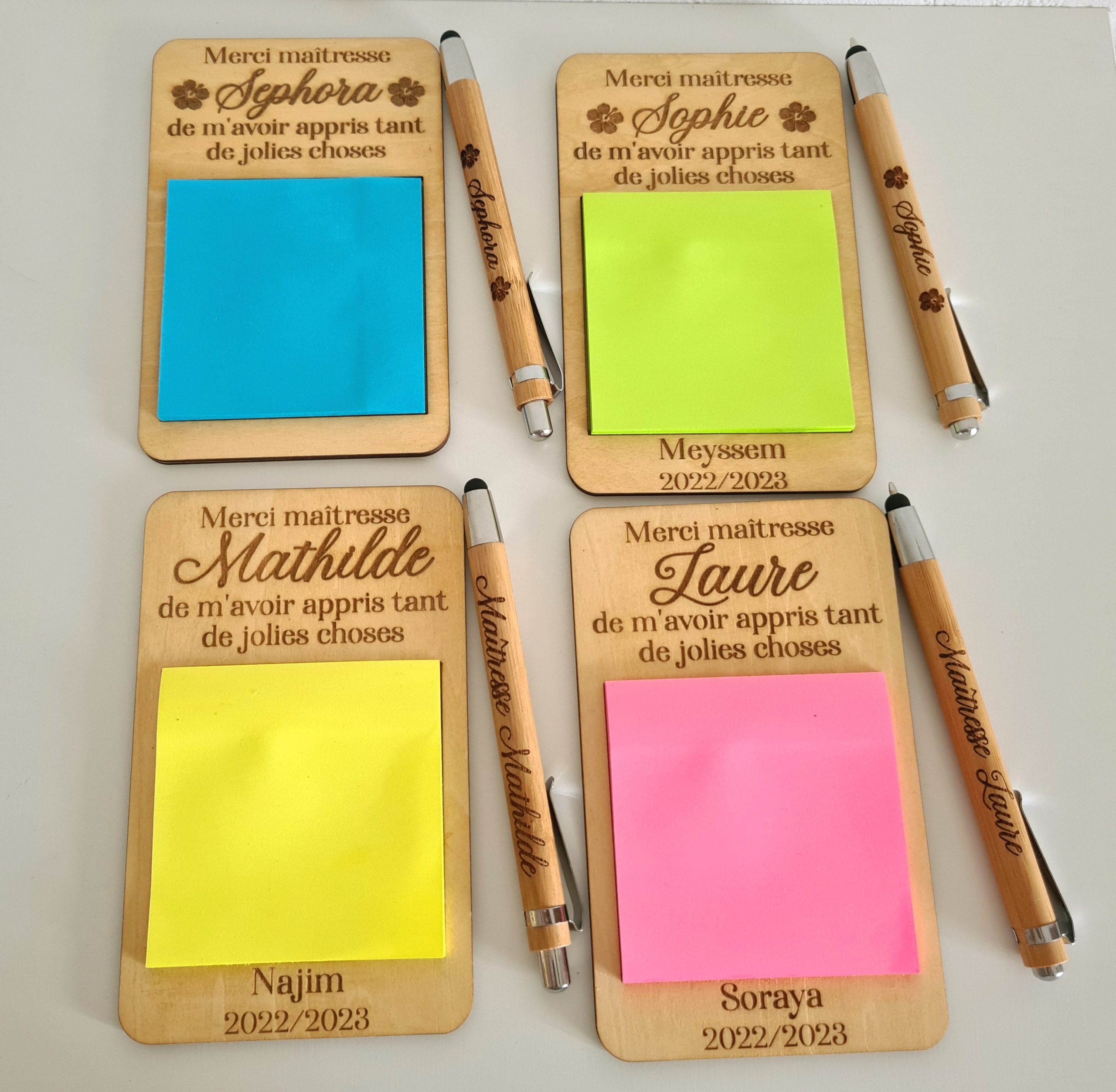 Ici je vous propose des supports à post its pour maîtresses. Vous pourrez y mettre le message de votre choix ainsi que la couleur du post it.